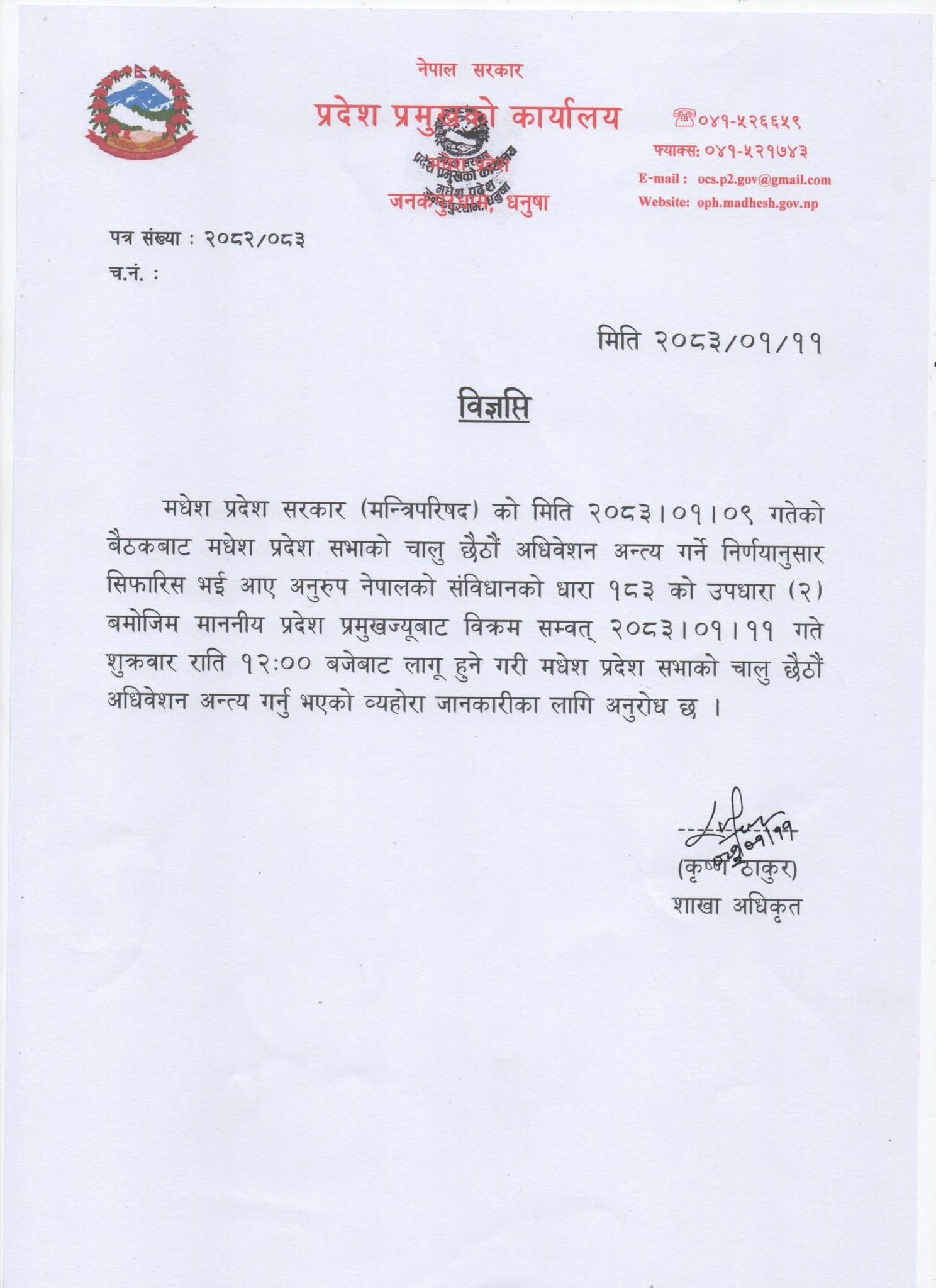 सोही सिफारिसअनुसार नेपालको संविधानको धारा १८३ को उपधारा (२) बमोजिम प्रदेश प्रमुखबाट अधिवेशन अन्त्य गरिएको जनाइएको छ ।