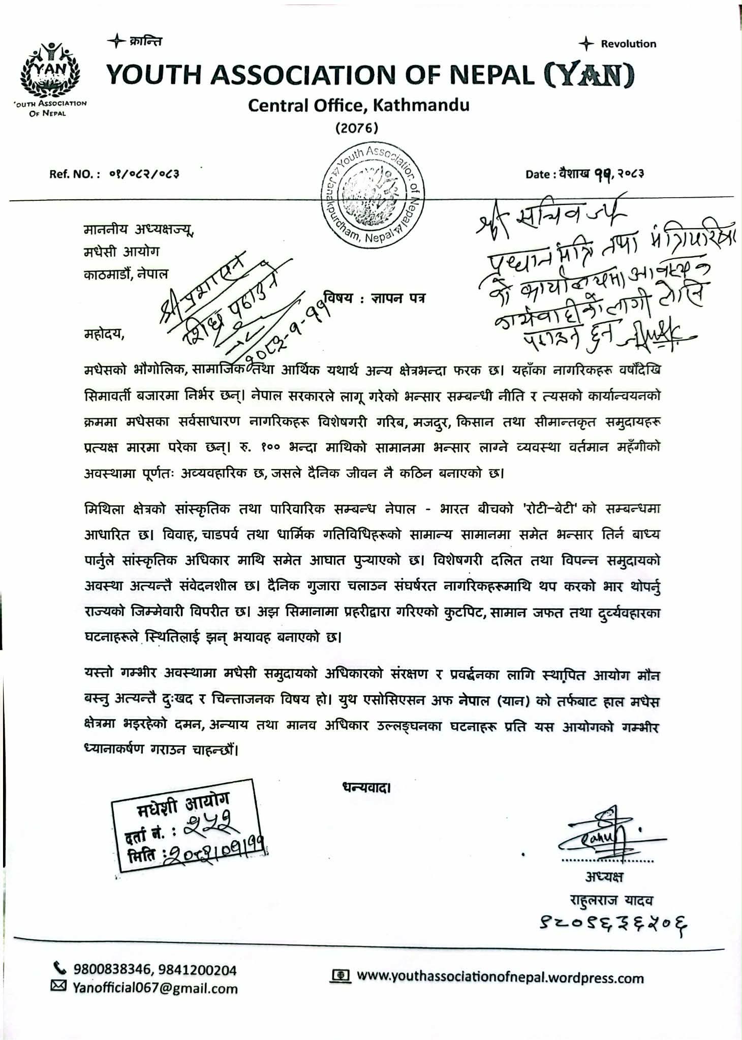ज्ञापनपत्रमार्फत यानले मधेशी समुदायको अधिकार संरक्षणका लागि स्थापित मधेशी आयोगले प्रभावकारी भूमिका खेल्नुपर्नेमा जोड दिएको छ । साथै, प्रधानमन्त्री तथा मन्त्रिपरिषद्को कार्यालयमार्फत आवश्यक पहल गरी नीतिगत सुधार गर्न माग गरिएको छ ।