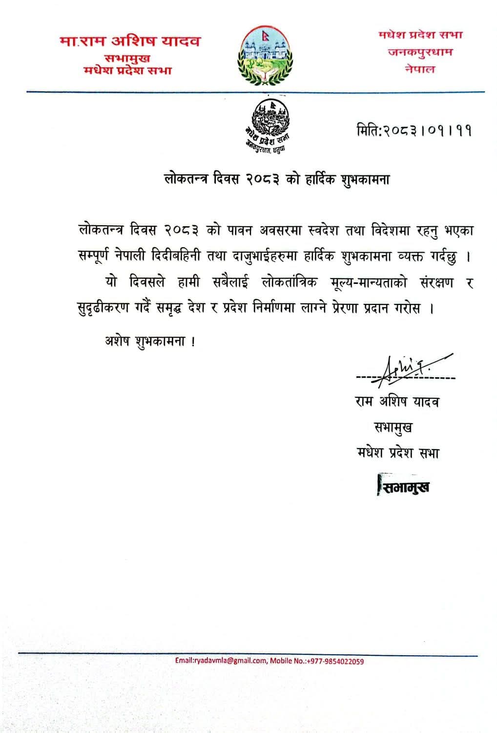 जनकपुरधाम, ११ बैशाख । मधेश प्रदेश सभाका सभामुख राम अशिष यादवले लोकतन्त्र दिवस २०८३ को अवसरमा सम्पूर्ण नेपाली नागरिकमा शुभकामना व्यक्त गरेका छन् ।