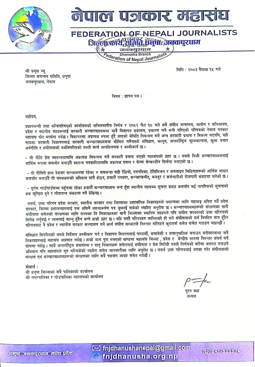 पत्रकार महासंघ धनुषाका अध्यक्ष पुरन साहको नेतृत्वमा गएको टोलीले जिल्ला समन्वय समिति धनुषाका प्रमुख राजनन्दन मण्डललाई औपचारिक रूपमा ध्यानाकर्षण पत्र हस्तान्तरण गरेको हो ।
